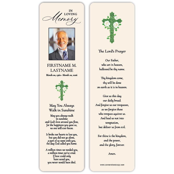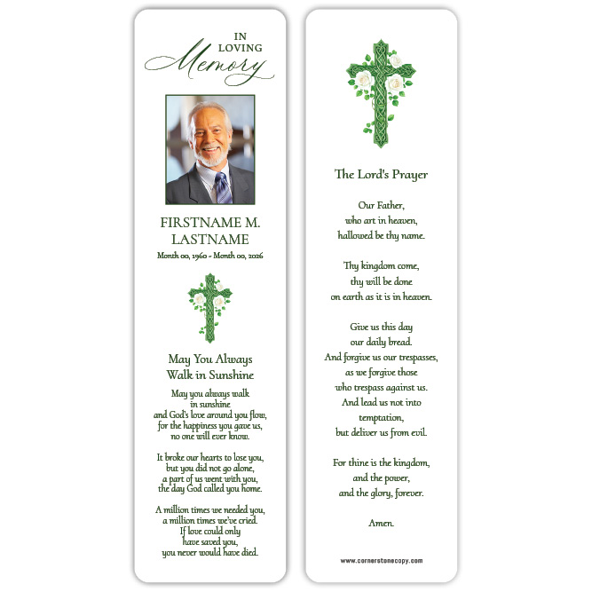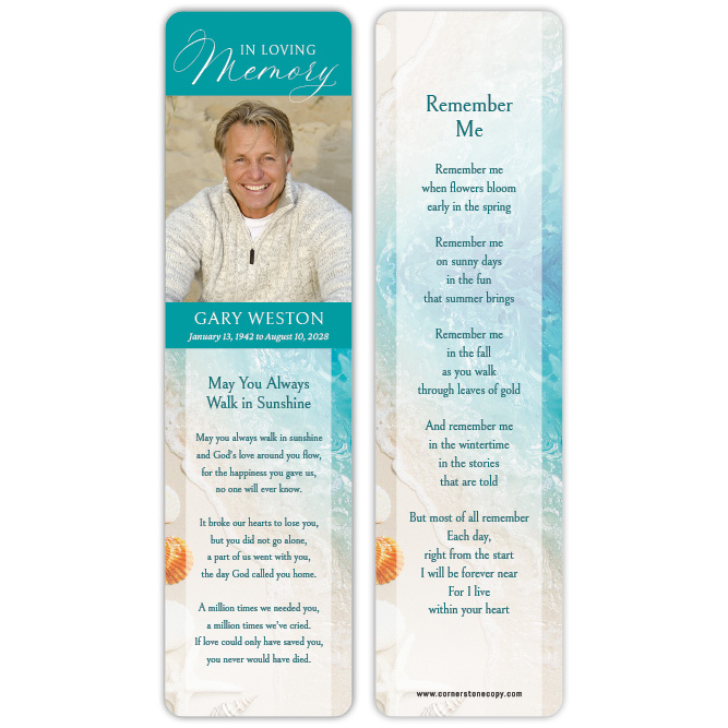 Memorial Bookmarks are designed in size 2.5 x 8.5 inches and include two-sided printing on your choice of card stock. Options to add rounded corners, drilling and flush-cut lamination available during checkout. Other sizes available when providing your own artwork. For full product information and pricing, click here.