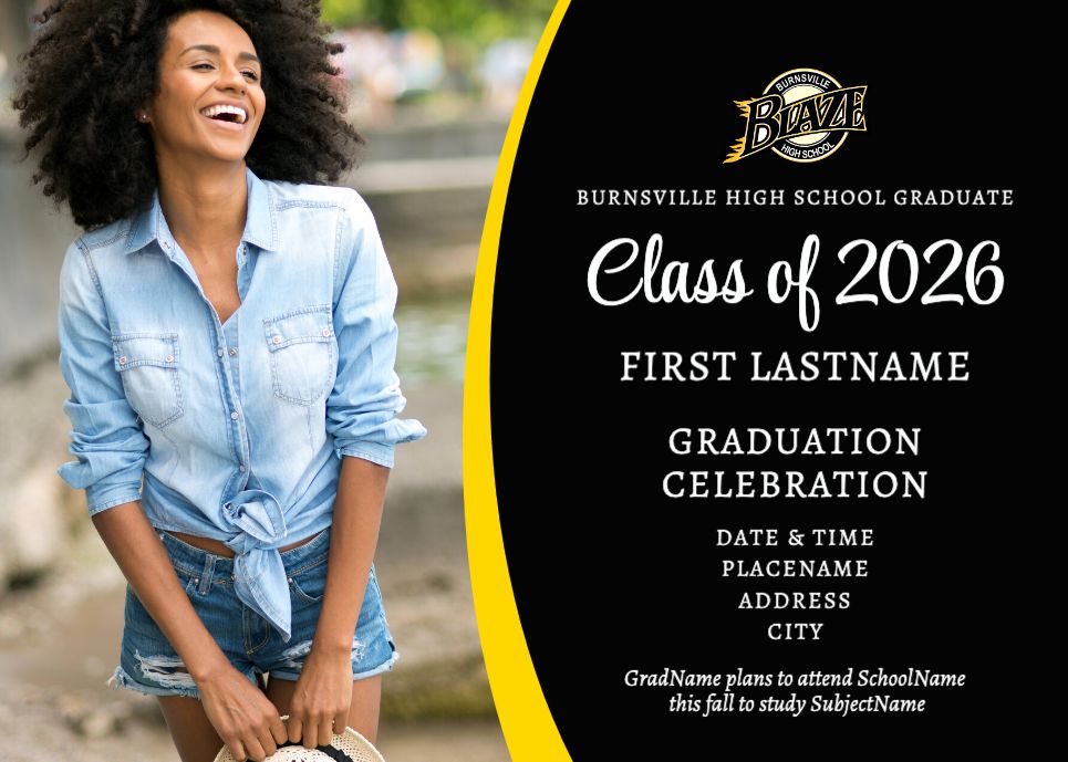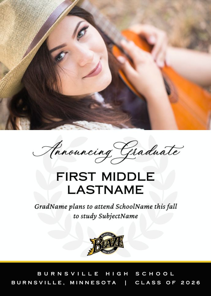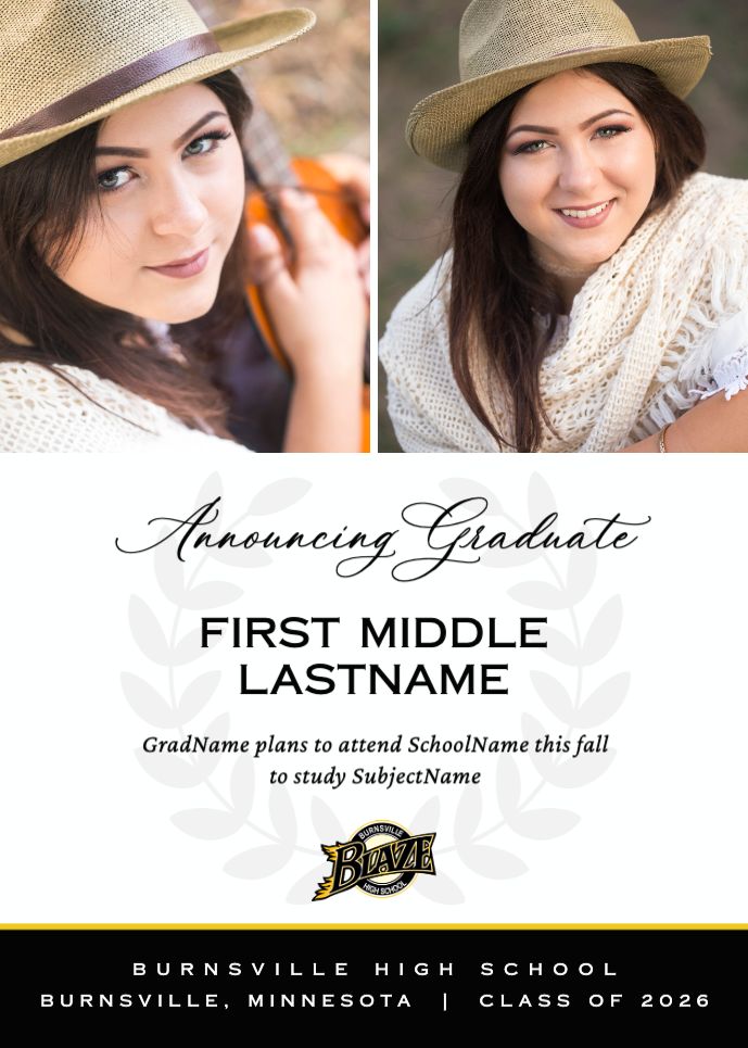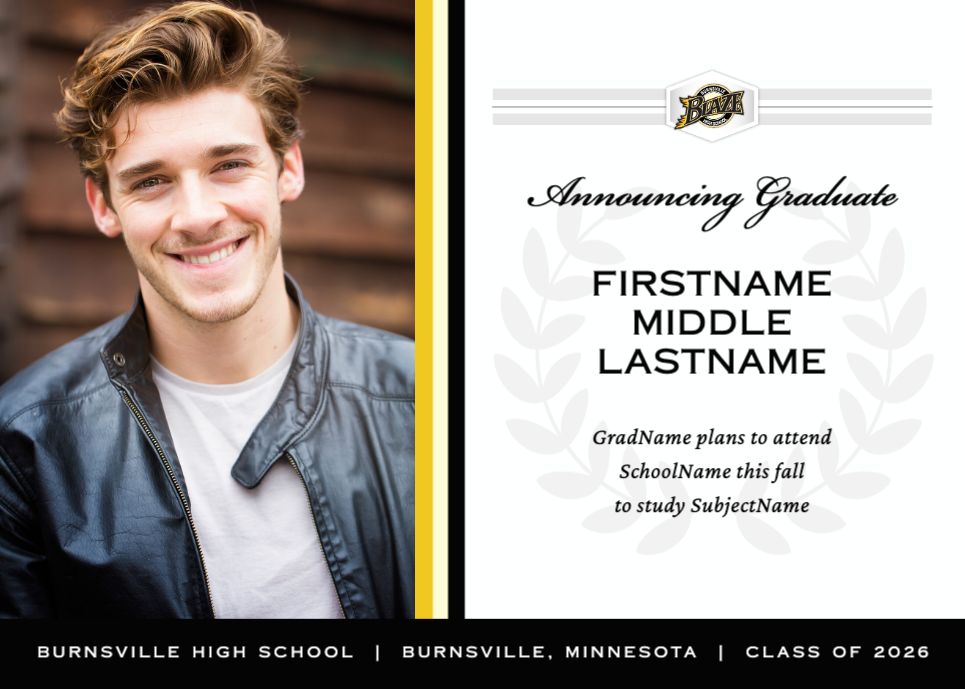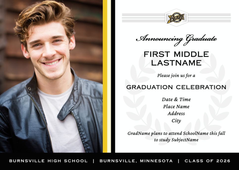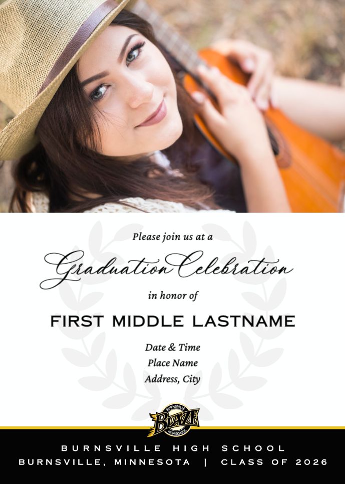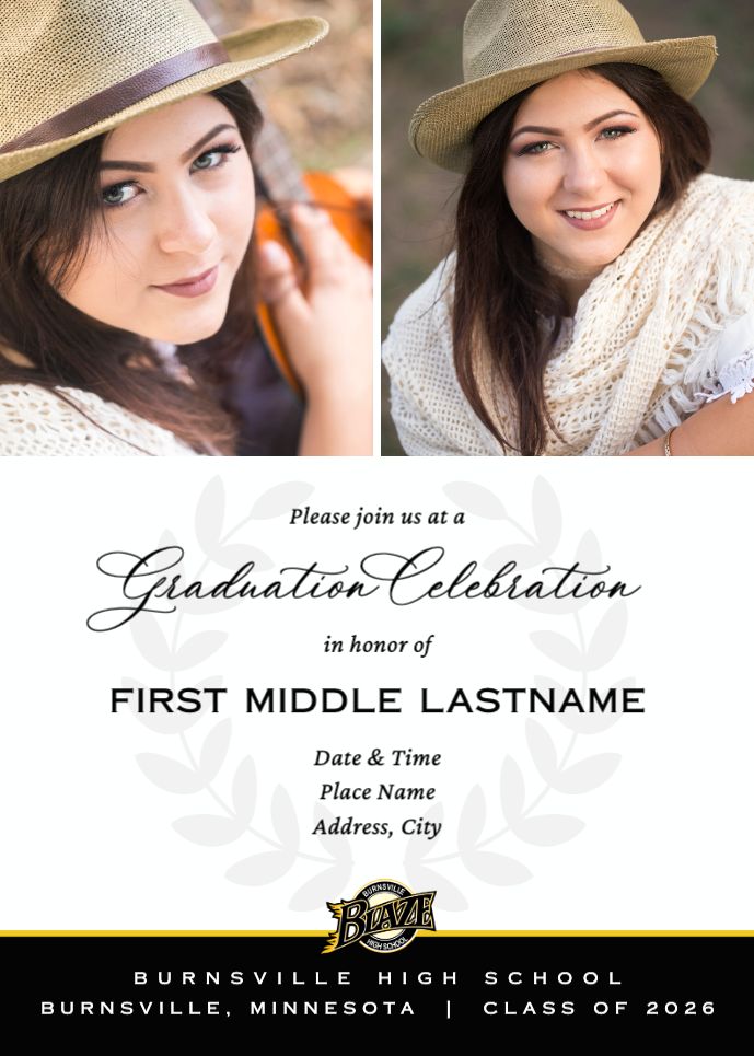 Graduation Invitation & Announcement design templates are printed 5 x 7 inches and include two-sided printing on your choice of card stock. Options to add rounded corners and matching envelopes available during checkout.