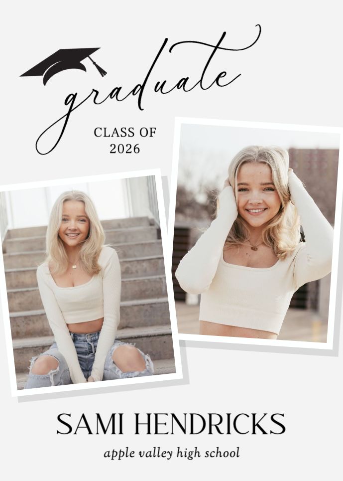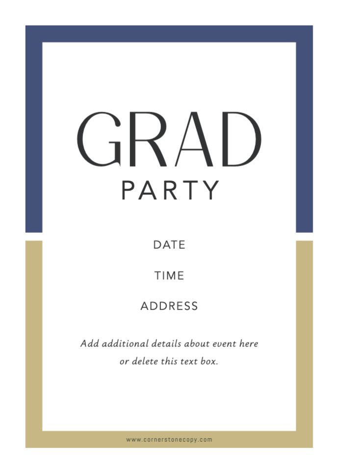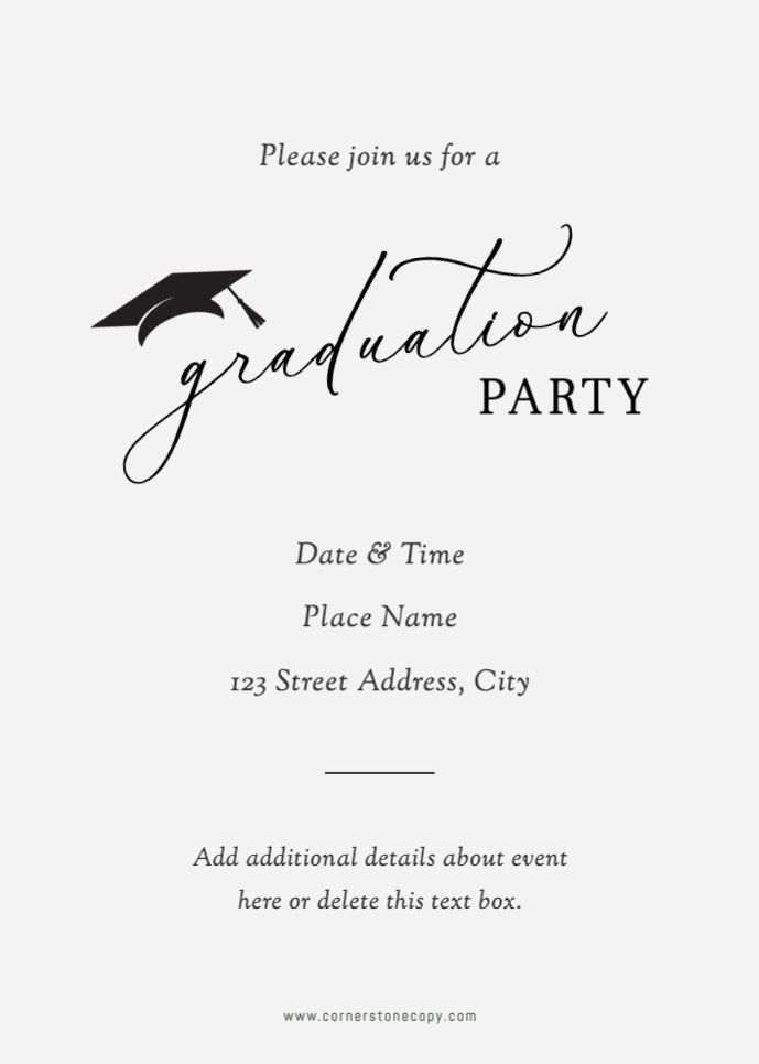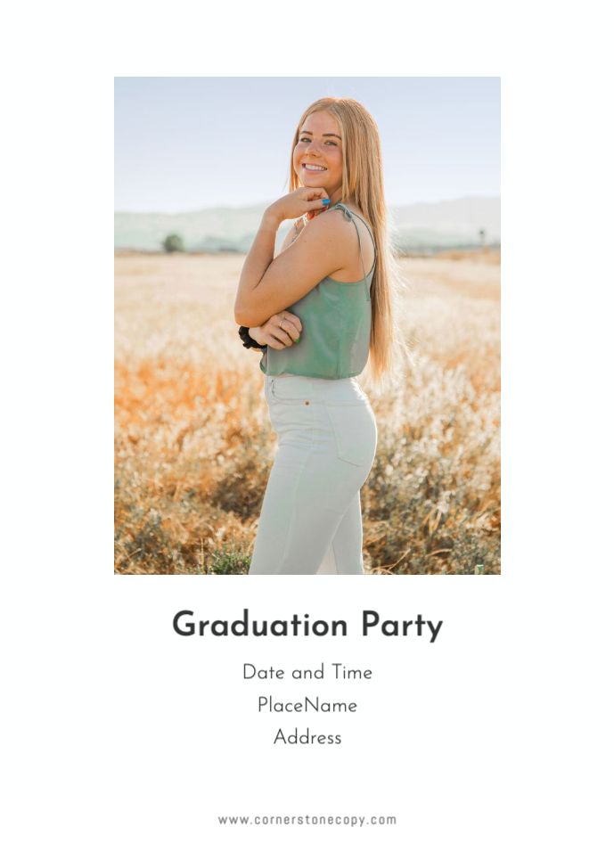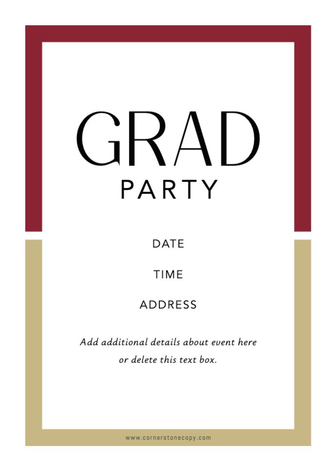 Graduation invitations & Announcement designs are printed 5 x 7 inches and include two-sided printing on your choice of card stock. Options to add rounded corners and matching envelopes available during checkout. Shaped, die-cut card designs also available, plus more sizes available when providing your own artwork, or when creating a design in the Cornerstone online designer. For full product information and pricing, click here.
