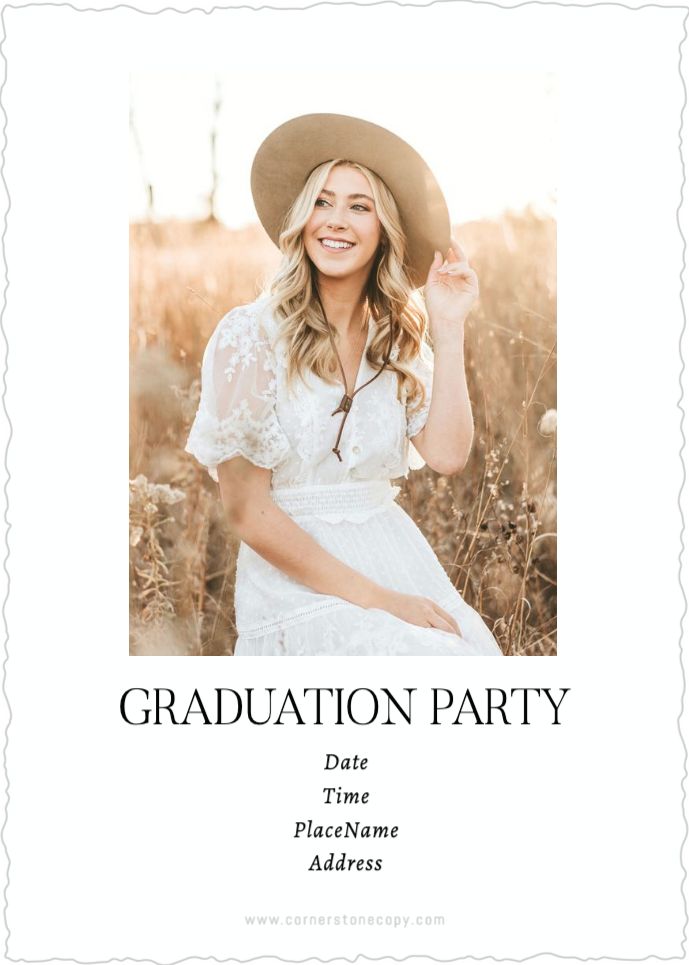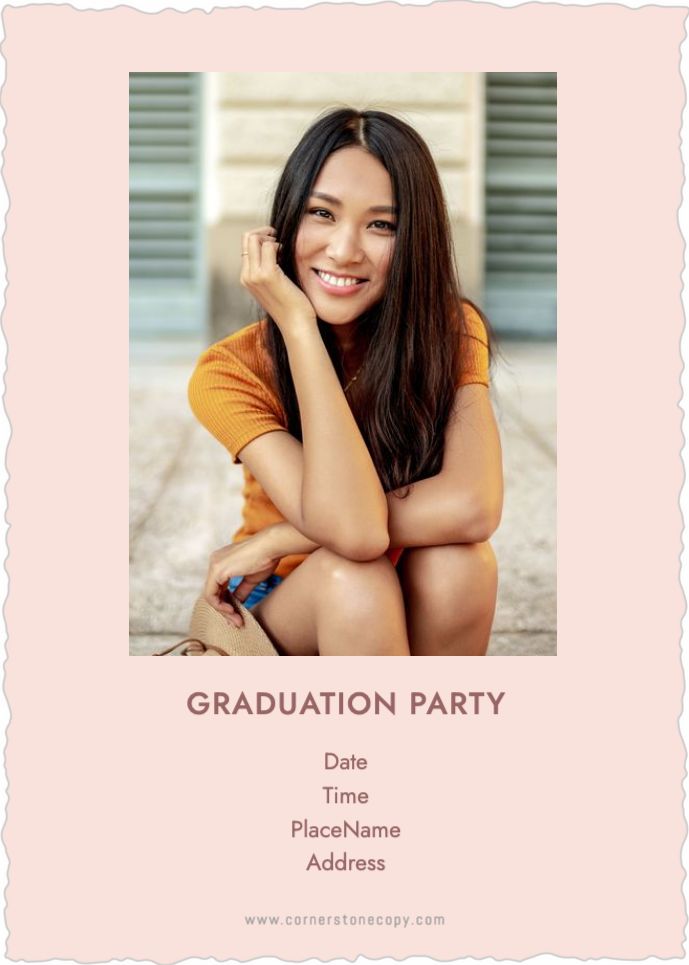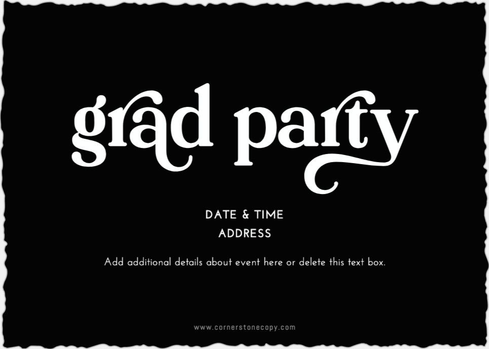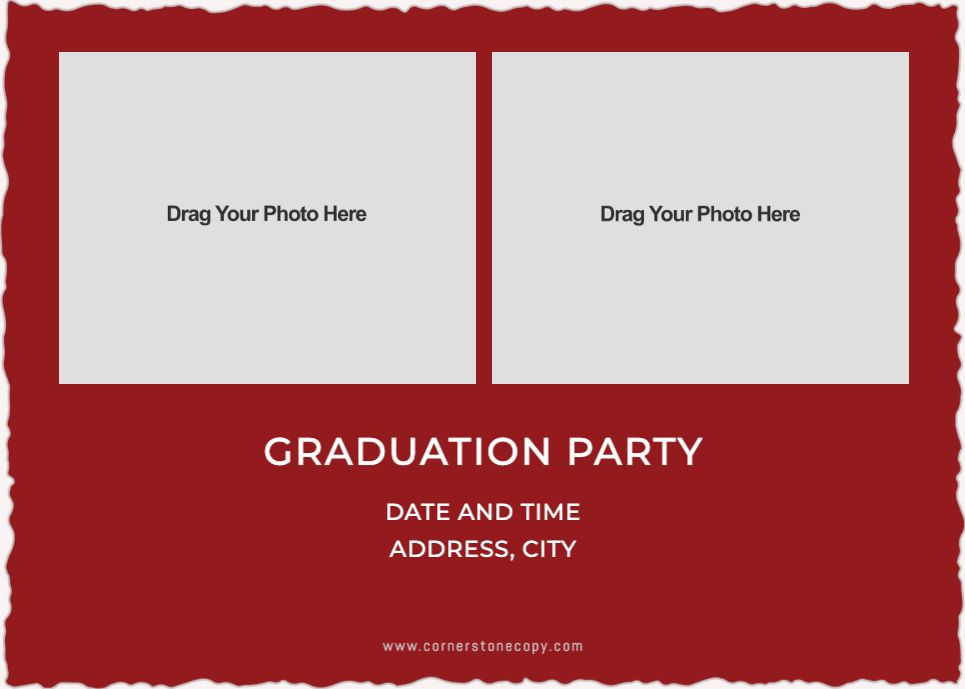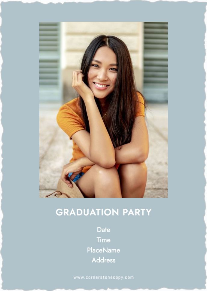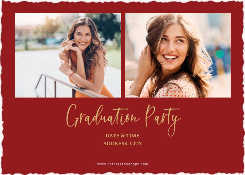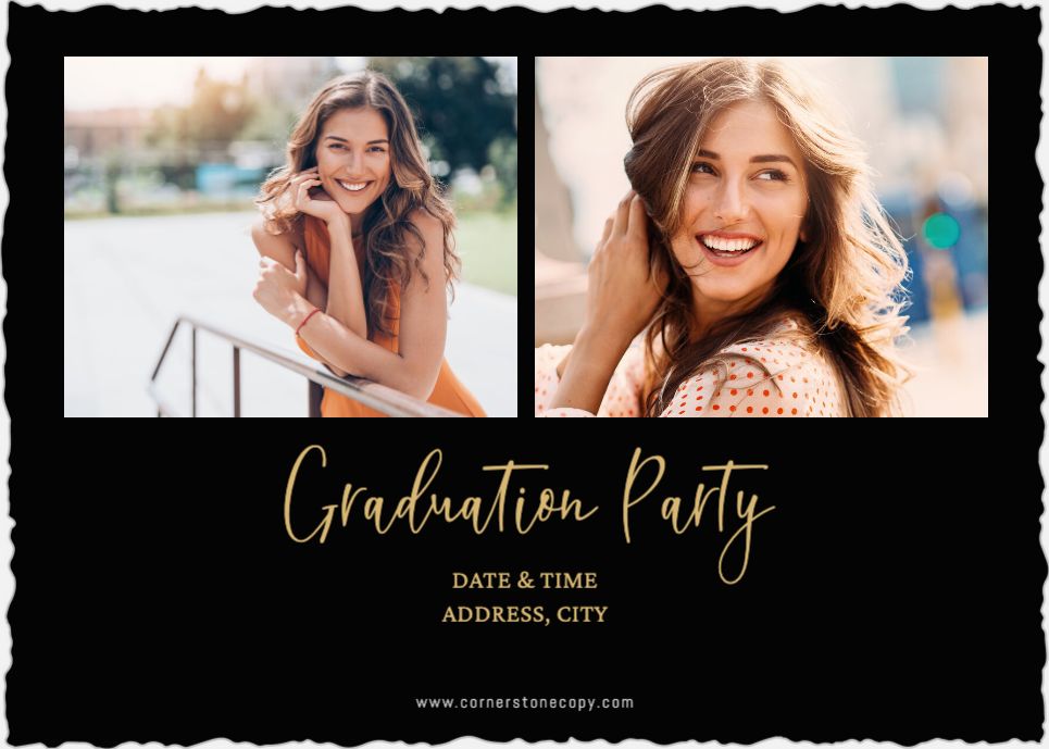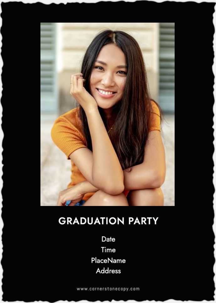 Graduation invitations & Announcement designs are printed 5 x 7 inches and include two-sided printing on your choice of card stock. Options to add rounded corners and matching envelopes available during checkout. Shaped, die-cut card designs also available, plus more sizes available when providing your own artwork, or when creating a design in the Cornerstone online designer. For full product information and pricing, click here.