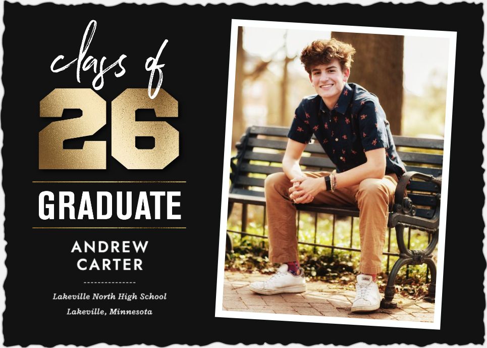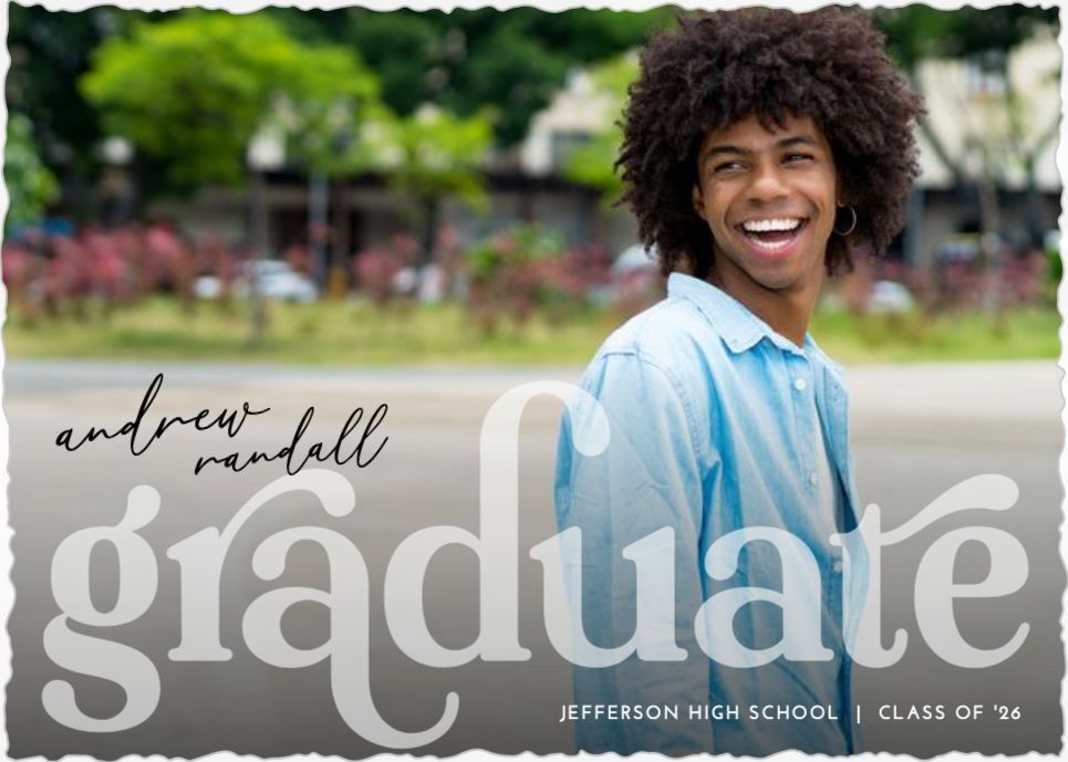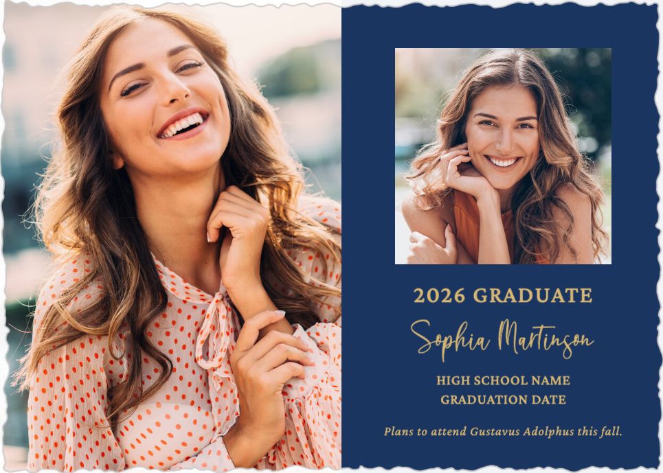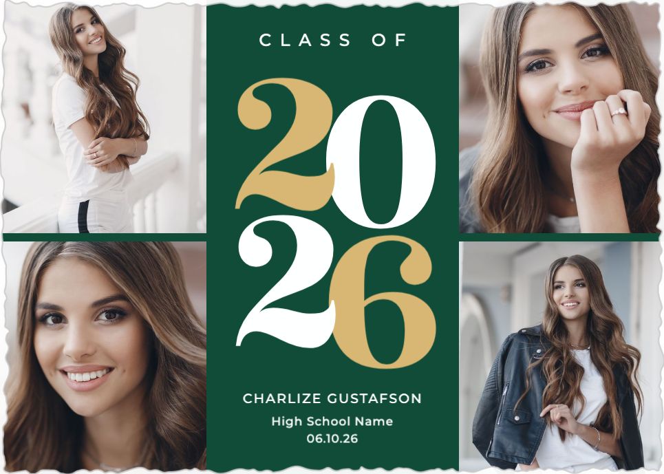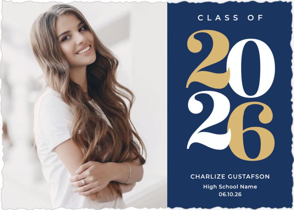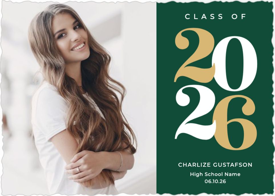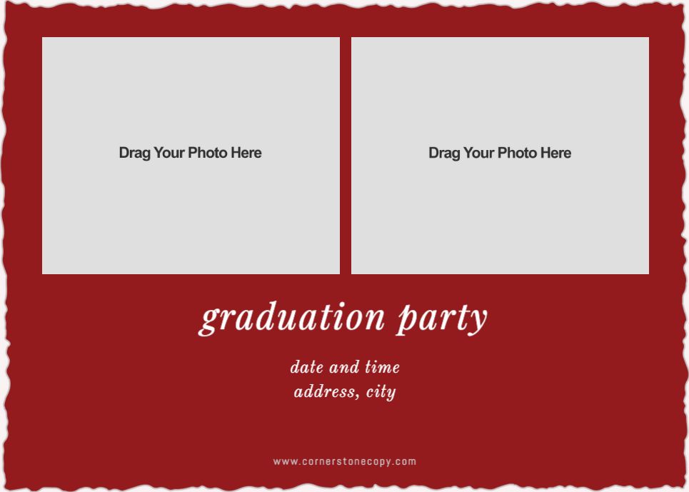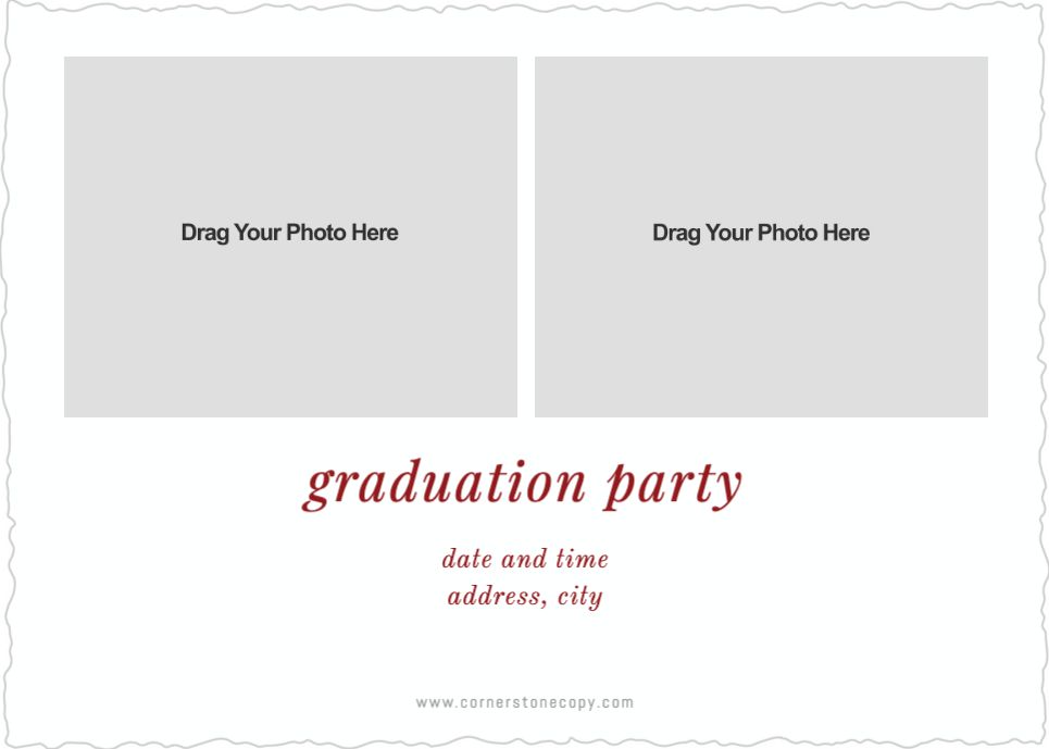Graduation invitations & Announcement designs are printed 5 x 7 inches and include two-sided printing on your choice of card stock. Options to add rounded corners and matching envelopes available during checkout. Shaped, die-cut card designs also available, plus more sizes available when providing your own artwork, or when creating a design in the Cornerstone online designer. For full product information and pricing, click here.