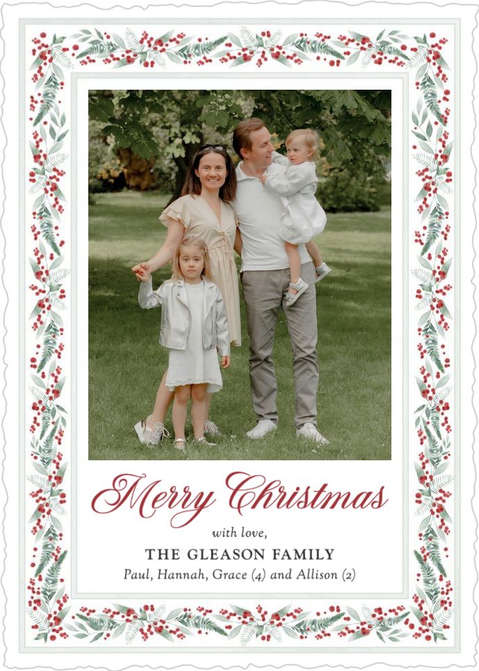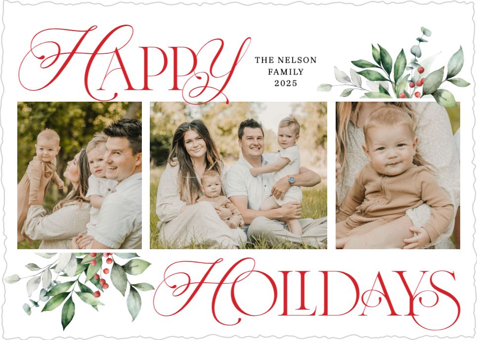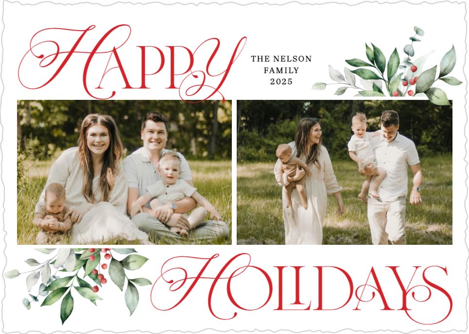 Holiday Photo Cards are flat cards printed at 5 x 7 inches and include two-sided printing on your choice of card stock. Options to add rounded corners and matching envelopes available during checkout. Shaped, die-cut cards also available, including Arch, Deckle Edge, Scalloped, Notched Corners and Christmas Tree shapes. For full product information, click here.