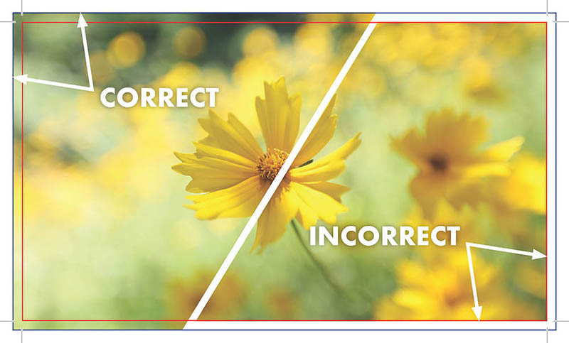 Below shows 'correct' and 'incorrect' examples of designing with bleed. The trim size is represented by a red line. The bleed area is the zone that extends past the page edge. On the side that is represented as 'correct', notice how the image extends past the red, trim line.