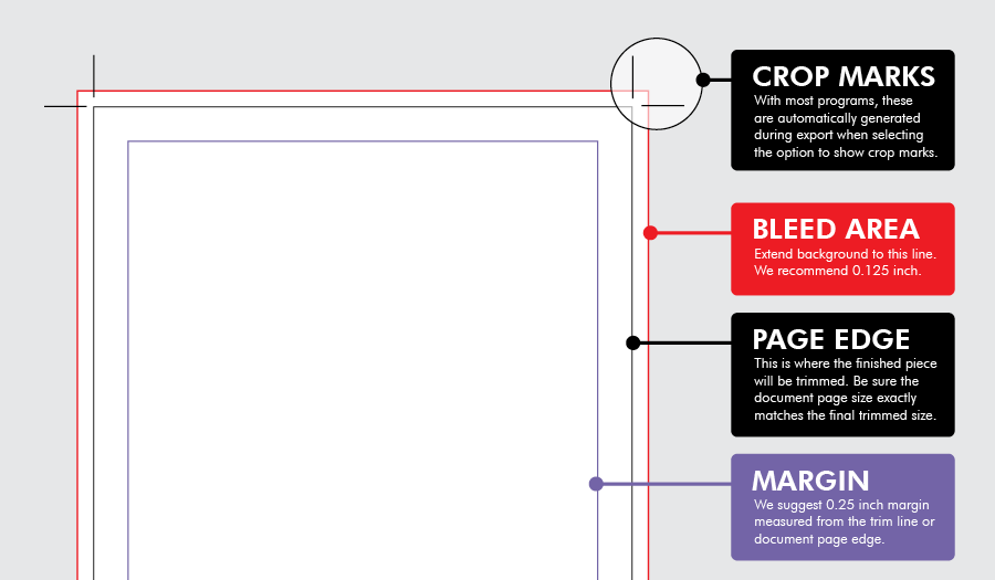 We recommend a bleed area of 0.125 inch (⅛ inch) past the document edge on all 4 sides.