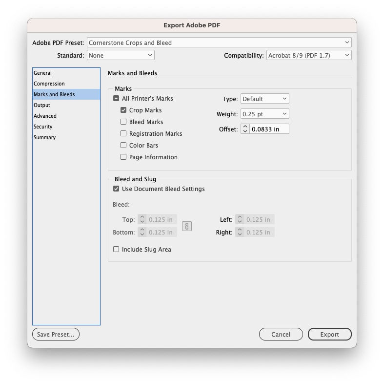 You final PDF should be a High Quality Print (@ 300 dpi). The file should include Crop Marks and Bleed Area. When exporting your PDF, be sure these items are configured properly so they show in the final file.